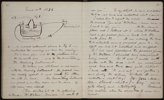 A 29 éves Alexander Graham Bell messzeszóló készülékének tökéletesítésén dolgozik, amikor kiborít egy kevés savat, és felkiált: „Mr. Watson. Come here. I want to see you.” A szomszéd szobában lévő segédje, Thomas Watson meghallja a vezetéken keresztül közvetített mondatot, és a segítségére siet. Ez volt a világ első telefonhívása.