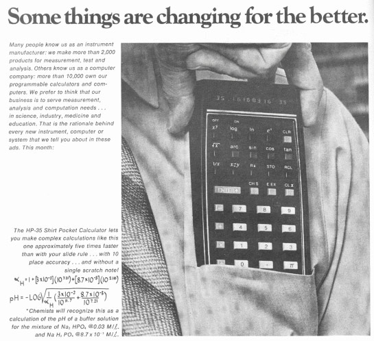 A Hewlett-Packard piacra dobja a világ első tudományos zsebszámológépét. A billentyűinek számáról HP-35-nek keresztelt kalkulátor elsőként volt képes egyetlen gombnyomással logaritmust és trigonometrikus függvényeket számolni. A vállalat nem számított nagy érdeklődésre a „logarléc-helyettesítő” termék iránt, de már az első évben százezer darab kelt el belőle. A HP-35 programja mindössze 767 utasításból állt.