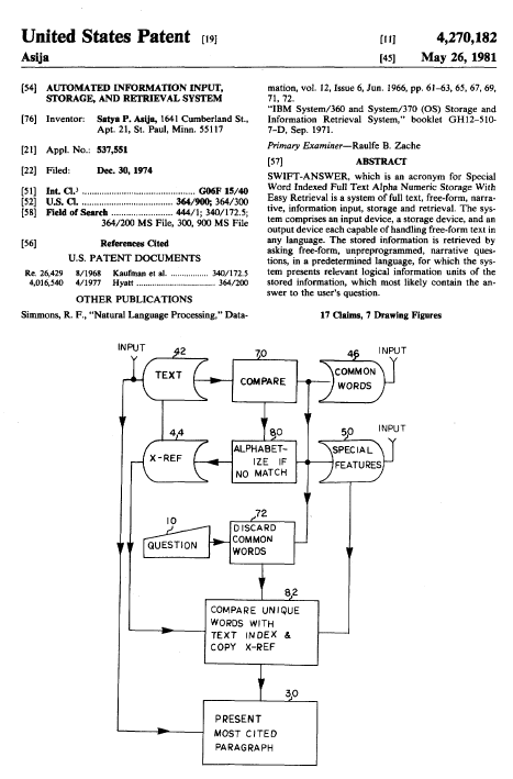 Megadják a szabadalmat Satya Pal Asija Swift-Answer névre keresztelt kérdésértelmező és válaszkereső programjára. Úgy tartják, ez volt az Egyesült Államokban az első eset, hogy egy tisztán szoftveres invenció szabadalmi oltalmat kapott. Az indiai születésű, mérnök végzettségű Asija hét évig küzdött a szabadalomért, közben elvégezte a jogi egyetemet is, hogy az ügyét képviselhesse. Öt évvel később kiadott könyvében (Hogyan védjük a számítógépes programokat?) e harc történetét írta meg.