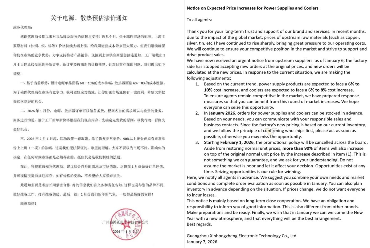 A közleményben a cég körülbelül 6-10 és 6-8 százalékos áremelkedést prognosztizál a tápegységek, illetve a hűtők szegmensében, de bátorítja az ügyfeleit, hogy adjanak, valamint foglaljanak le rendeléseket még a hónap folyamán, noha a teljesítés a meglévő raktárkészlettől, továbbá szállítási prioritástól függ majd. Február 1-jétől minden promóciós tevékenység megszűnik, és aztán a termékek több, mint 90 százaléka az új, megemelkedett áron kerül értékesítésre.