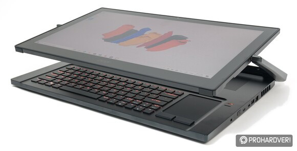 Sokat nem érdemes ragozni a D9 külsejét, a Triton 900 kapcsán tulajdonképpen már mindent elmondtunk róla. Itt is ugyanazt a masszív, tabletté alakítható dizájnt kapjuk az Ezel Aero Hinge névre hallgató zsanérokkal, melyek ugyan sok beállítási lehetőséget kínálnak, de alaposan hozzátesznek a 17,3”-es kijelző alapból is tiszteletet parancsoló.