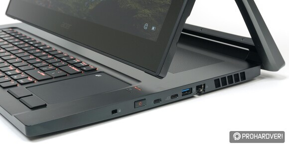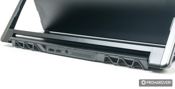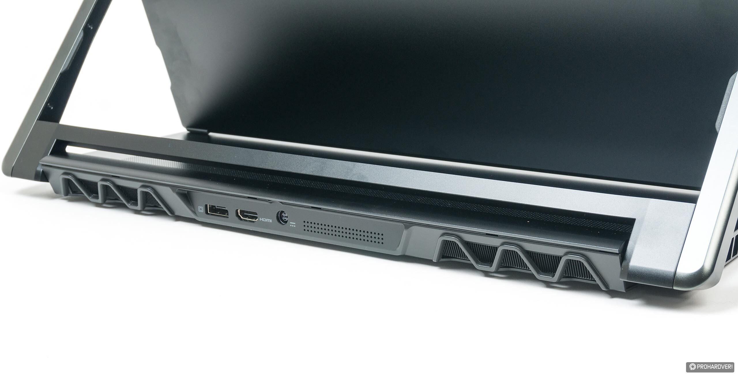 Némi változást tapasztalhatunk a csatlakozók sorában is, de ennek oka, hogy a korábban vizsgált Triton 900 még nem a végleges házba került – egyébként itt is ugyanazokat a kivezetéseket kapjuk, azaz összesen négy USB, egy Thunderbolt 3, egy HDMI és egy DisplayPort áll rendelkezésre a gigabites Ethernet mellett. Természetesen mindegyik oldalon találunk egy szellőzőnyílást is, de az ezek mögött felsejlő hűtőbordázat nem kaptam meg a Triton kék eloxálását.