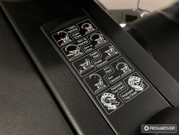 A vezérlőpanelen találunk még két kapcsolót, melyekkel a Zero-g funkciót kapcsolgathatjuk, ez lényegében szinte fekvő pozícióba dönti a széket az asztallal együtt, valamint felemeli a monitorokat és kihajtja a lábtámaszt.