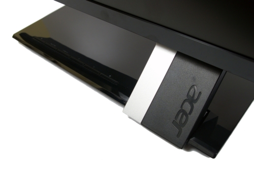 Az S235HL-t java részben fényes fekete műanyag borítja, beleértve a kávát és a talp burkolatát, valamint az imént emlegetett merevítést. Matt felülettel a hátlapon és a tartóállvány előlapján végighúzódó alumínium sáv mellett találkozhatunk. Ez utóbbiba vésve láthatjuk a márkajelzést, és hasonlóval találkozhatunk a hátoldal jobb felső sarkában is. Minden bizonnyal az Acer új kijelzőjének külseje megosztja az olvasókat és majdan a leendő vásárlókat, de egy dizájntermék esetében ez természetes reakció, mindenesetre a monitor által elnyert iF dizájndíj önmagáért beszél.