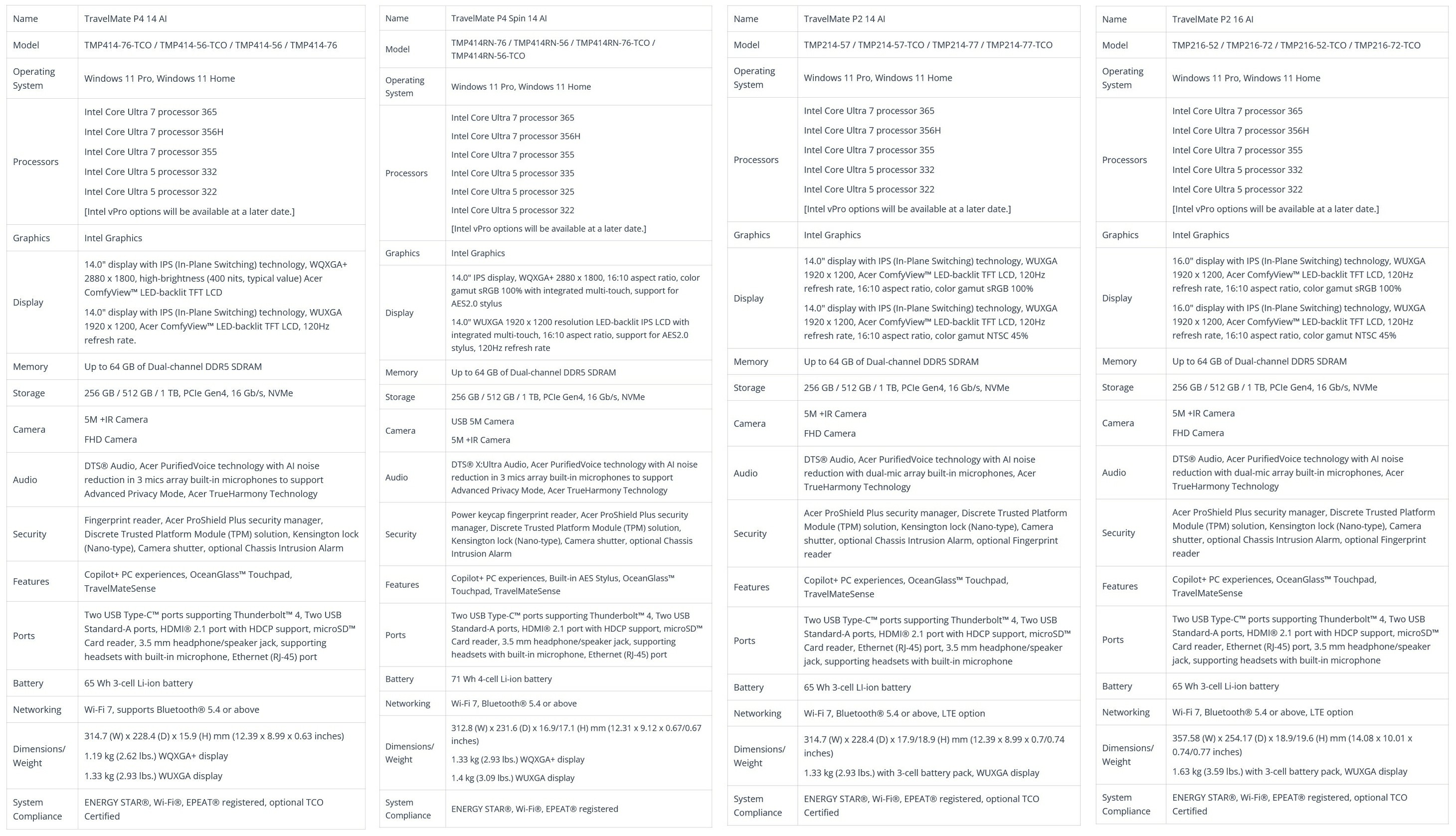 A maximum 64 GB SO-DIMM DDR5 memóriával felvértezhető, alumíniumházas gépek PCI Express 4.0-s SSD-je 256 vagy 512 GB-os, netán 1 TB-os lehet, és Wi-Fi 7/Bluetooth 5.4 moduljukat potenciális LTE modem egészítheti ki a P2 sorozatnál. A BIOS-uk, illetve az Acer Office Manager szoftver révén hatékony menedzselési lehetőséget biztosító mobilvasak chiclet billentyűzete alatt OceanGlass üveggel bevont tapipad terpeszkedik, és fedélzetükön egy 2.1-es HDMI kimenet, két Thunderbolt 4 kapu, két USB Type-A csatoló, egy microSD kártyaolvasó, egy gigabites Ethernet, valamint egy 3,5 mm-es kombójack nyert elhelyezést.