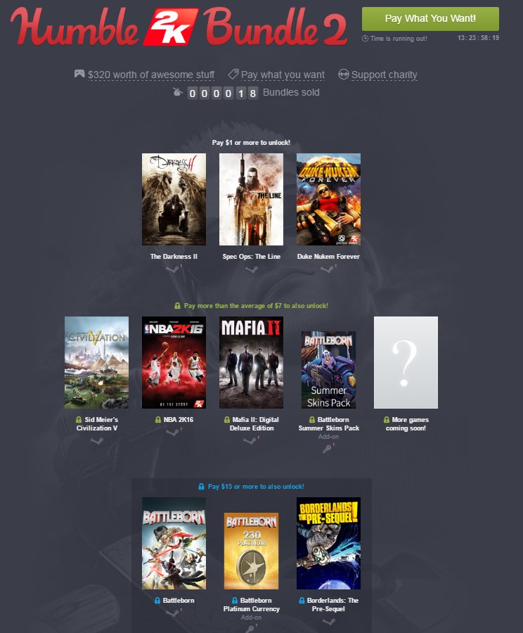 Az elkövetkező közel két hétben a Humble 2K Bundle 2 nyújt az érdeklődők számára néhány játékból álló csomagot, amelyben jelenleg 8 különböző alkotás vásárolható meg 15 dollár befizetése után. Természetesen az 1 dolláros minimum limit továbbra is él, az új előfizetők a havi Bundle csomagokra 10% kedvezményt kapnak, de az XCOM 2 is olcsóbban szerezhető be a pakkal.