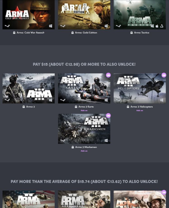 Ha valakinek kimaradt volna anno az ARMA sorozat, annak érdemes lehet rápillantania a Humble Bundle legújabb akciójára, amelyben a széria több része, valamint néhány kiegészítő szerezhető be olcsóbban. A 13 tételt tartalmazó legnagyobb csomag 20 dollárba kerül, de akár már 1 dollár befizetése után is gazdagabbak lehetünk 3 résszel.