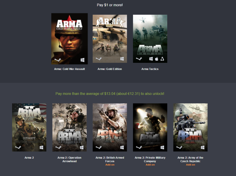 Az elkövetkező közel két hétben a Humble ARMA Bundle nyújt az érdeklődők számára egy kisebb csomagot, amelyben az Arma széria több része és azok DLC-i vásárolhatóak meg 15 dollár befizetése után. Természetesen az 1 dolláros minimum limit továbbra is él, az új előfizetők a havi Bundle csomagokra 10% kedvezményt kapnak.