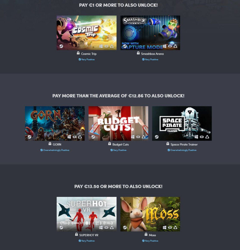 Az elkövetkező közel két hétben a Humble VR Bundle nyújt az érdeklődők számára egy méretes csomagot, amelyben jelenleg néhány VR cím szerezhető be olcsóbban, pontosabban 13,5 euró befizetése után. Természetesen az 1 dolláros minimum limit továbbra is él, valamint Humble Choice előfizetési kedveményt is kapunk az első hónapra, illetve három játék zenei albumához is kapunk hozzáférést. (Cosmic Trip, GORN, Space Pirate Trainer)