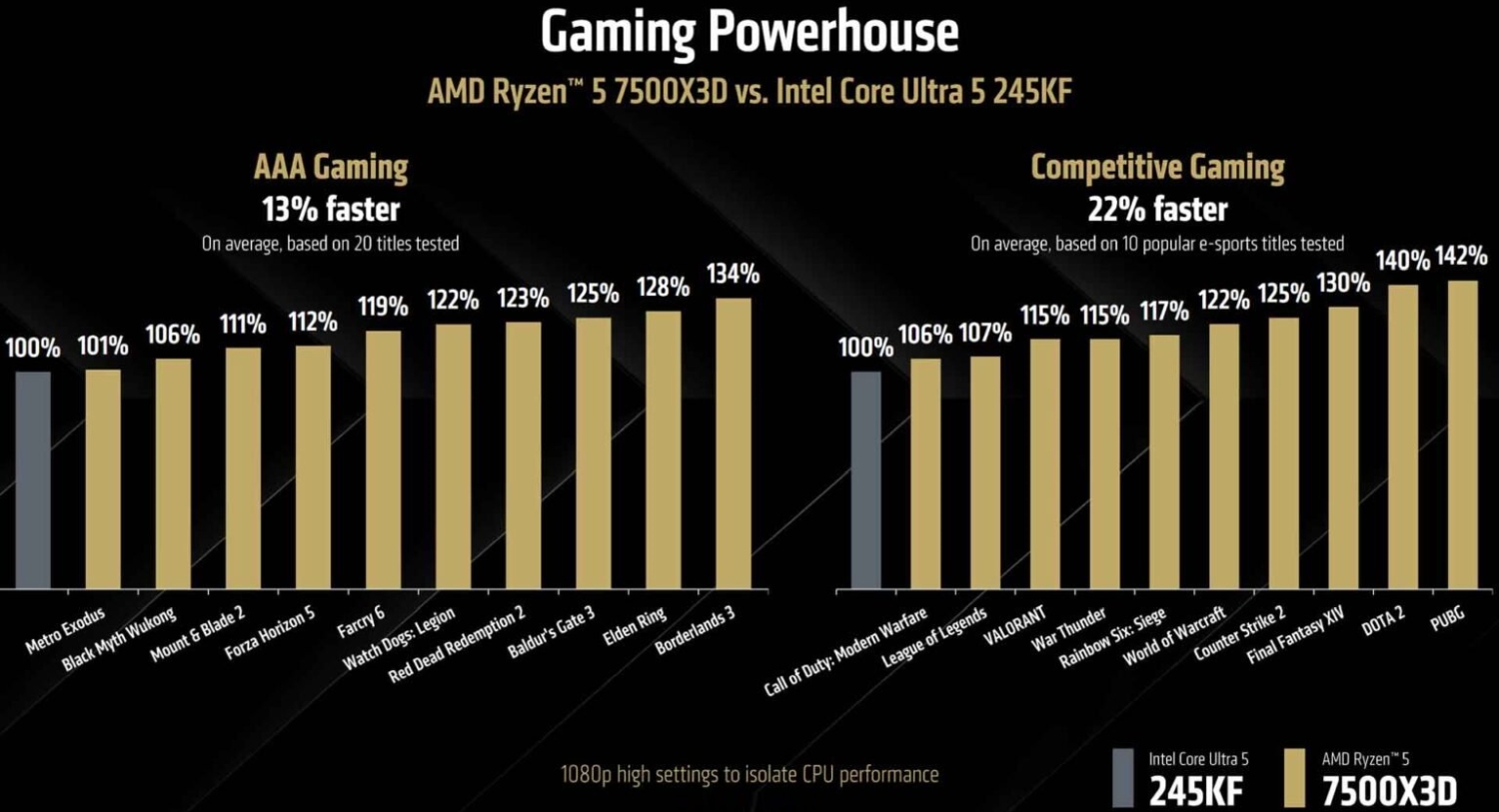 A friss CPU-val a cég nekimegy az Intel Core Ultra 5 245KF-nek, amely a konkurens oldal egyik legkedveltebb, új platformra épülő megoldása a játékosok körében, nem véletlen hát, hogy az AMD direkten ezt célozza, ajánlatuk pedig egy átlagosan 13-22%-kal gyorsabb megoldás, méghozzá olcsóbban.