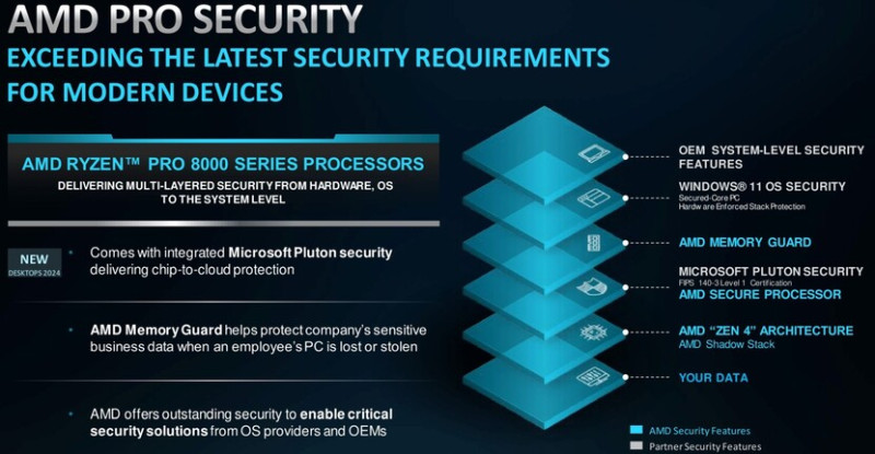 Az újdonságok közül a Ryzen PRO 8000G sorozat Socket AM5, a Ryzen PRO 8040 pedig FP7 BGA tokozást használnak, továbbá elérhető a PRO termékcsalád legfontosabb képessége a GuardMI technológia, ami leginkább egy gyűjtőnévként funkciónál, és alapvetően azt jelzi a potenciális vásárlóknak, hogy a hardvert a biztonságra tervezték.