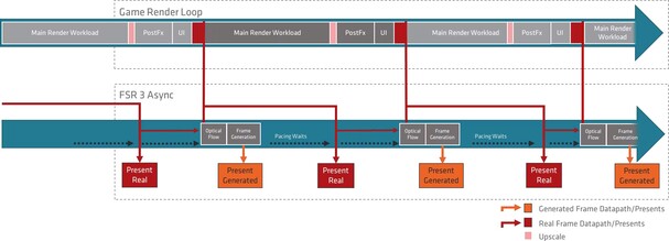 Mint ismeretes a felskálázó eljárás három nagyobb modulból áll. Ott az alapot biztosító, felskálázásért felelős rendszer, amit kiegészít a képkocka generálását megoldó Fluid Motion Frames technológia, illetve a késleltetést csökkentő Radeon Anti-Lag+. Természetesen a felskálázás már nem számít akkora újdonságnak, így a lényeg a Fluid Motion Frames, amely a FidelityFX Super Resolution 3 fejlesztőkörnyezetében kerül szállításra, tehát a játékba lesz beépítve, és a megfelelő adatokkal táplálva két számolt képkocka közé generál egy újat, tehát működési elvben hasonló a DLSS 3-hoz.