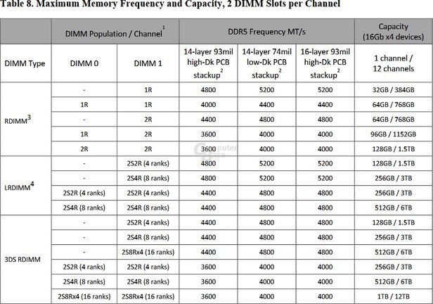 Az 5,2 GHz-es effektív órajel LRDIMM modulokkal érhető el, és ebben az esetben csatornánként 256 GB alkalmazható, ami összességében 3 TB-os kapacitást jelent. A további kombinációk a fenti képtáblázaton olvashatók.