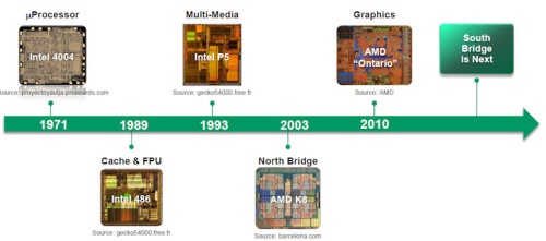 A Hot Chips 24 töretlenül folytatódik, így az AMD a Jaguar és a Steamroller architektúrák ismertetése után az integráció további lépcsőit vette górcső alá. Kis PC-s történelmet felelevenítve eléggé nyilvánvaló, hogy merre halad a piac. Az Intel 4004-es mikroprocesszor 1971-es megjelenése óta már integrálásra kerültek a gyorsítótárak és a lebegőpontos egység, mely 1989-ben történt meg először az Intel 486-os termékével. 1993-ban bemutatkozott az Intel Pentium, mely a P5-ös kódnevet viselte, és szuperskalár architektúrára épültek. Nagyjából 10 évig apróbb előrelépések történtek, mígnem az AMD 2003-ban bemutatta a K8-as kódnevű processzormagot, mely lényegében az Athlon 64 volt, és elsőként integrálta az északi hidat, azaz lényegében a memóriavezérlőt a processzorba. A következő nagy lépés a grafikus vezérlő integrálása volt, ami 2010-ben jött el a Brazos platform alapját képző Ontario APU bemutatkozásakor. Az integráció megy tovább és a következő nagy lépcső a déli híd integrálása lesz, mely 2013-ban megtörténik a PC-kbe szánt termékek esetében. Felvethető azonban a kérdés, hogy mi lesz a többi technológiával, mint a rendszermemóriáként szolgáló DRAM-mal.
