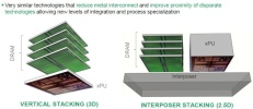 A DRAM integrálása kizárt, és erre nem is folynak kísérletek, egyszerűen ehhez túl komolyak fizikai korlátok, de ha nem is lehet integrálni, mindenképp érdemes átgondolni egy másik lehetőséget. A memória processzormag mellé való tokozása abszolút nem új ötlet, sőt az ultramobil termékek esetében alkalmazzák is, de a jövőben a nagyobb teljesítményű PC-s lapkákban is szerepe lehet, hiszen a rendszermemória elérésének sebessége egyre fontosabb szempont. Alapvetően két lehetőséget mutatott be az AMD. Az egyik a vertical stacking, ami elterjedtebb formában 3D stacking néven ismert. Ilyenkor a DRAM magára a lapkára kerül, legyen az CPU, APU, GPU vagy SoC. A lényeg alapvetően azon van, hogy a DRAM chipek vertikálisan egymásra kerülnek, és ez elég gyors elérést, illetve – a buszszélességétől függően – sávszélességet biztosít. A másik opció az úgynevezett interposer stacking, mely gyakorlatilag 2.5D TSV (through-silicon VIA – Vertical Interconnect Access) stacking. Ilyenkor a DRAM chipek nem magára a lapkára, hanem egészen konkrétan mellé kerülnek, és az összeköttetést egy interposer biztosítja, mely végül a tokozásra kerül fel. A funkcionális előnyök itt megegyeznek a 3D stackinggel, csak más a megvalósítás elve.