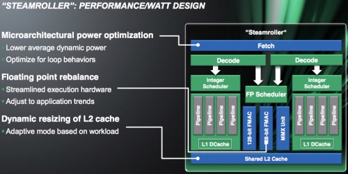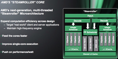 Az AMD az első Bulldozer architektúrára épülő processzor után idén már bemutatta a Piledriver kódnevű modult, mely elsősorban az energiahatékonyság szempontjából jelentett előrelépést az elődhöz képest, így tökéletes alapot képzett a Trinity APU-ba. A vállalat azonban korábban már közölte, hogy a következő generációs Steamroller modul főleg a teljesítmény növelésére fog koncentrálni, és a Bulldozer modul gyengébb pontjait foltozza be. A Hot Chips 24 alkalmával Mark Papermaster röviden taglalta is, hogyan is gondolják ezt.