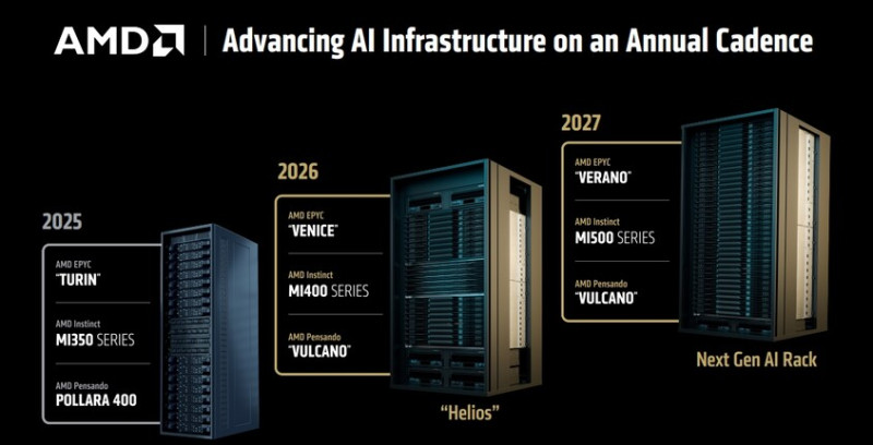 A vállalat már a következő generációs AI rackkel is készül, amely majd a Verano kódnevú EPYC platformra épül, Instinct MI500 sorozatú gyorsítókkal, illetve Vulcano NIC megoldással, de az előbbi kettőről még nem tudni, hogy konkrétan mikor érkeznek.