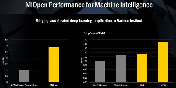 Az jelölésrendszerben is van logika, ugyanis az MI (Machine Intelligence) mögötti a szám az adott hardver kevert, 16 bites lebegőpontos precizitás melletti számítási teljesítményének a matematikailag pontos kerekítése. Az 5,7 TFLOPS ezért jelent MI6-ot, a 8,2 TFLOPS pedig MI8-at. Ezek alapján az MI25-ból kitalálható, hogy a Vega 10 lapkával szerelt modell számítási teljesítménye valahol 24,6 és 25,4 TFLOPS között lesz kevert pontosság esetén.