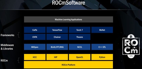 A Radeon Instinct szoftveres alapját a ROCm csomag adja, amely kiegészül a nagy teljesítményre kihegyezett MIOpen könyvtárral. Utóbbit az AMD kifejezetten a GCN architektúrához fejlesztette ki, és a cég állítása szerint majdnem háromszor jobb tempó érhető el vele a szabványos GEMM-alapú konvolúciós kódnál.
