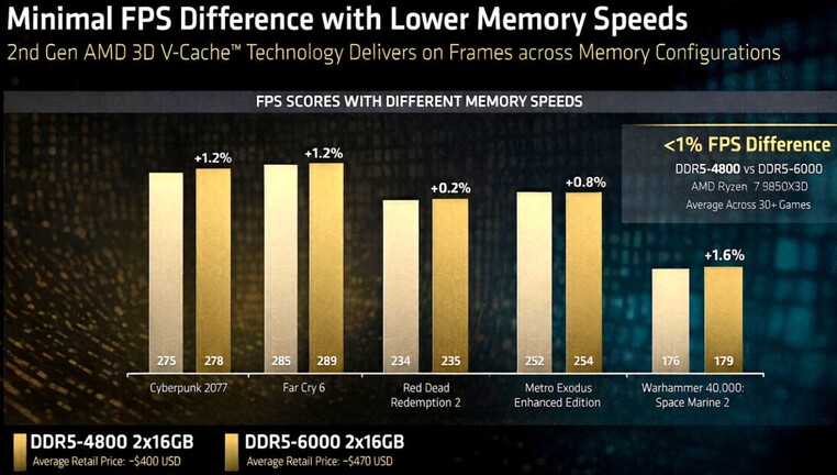 Az AMD szerint a Ryzen 7 9850X3D-nek a 4,8 GHz-es effektív órajelen üzemelő DDR5-ös memória is megteszi, hogy közel legyen a csúcsteljesítményéhez, ugyanis a 6 GHz-es alternatívához viszonyítva átlagosan 1%-nál is kisebb a hátrány, ami a játékokban kimérhető.