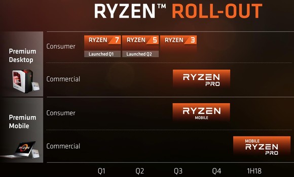 A Ryzen 3 sorozat fog a legkorábban érkezni, méghozzá a nyár elején, és ez hozza a legolcsóbb, de persze ennek megfelelően leglassabb, Summit Ridge lapkára épülő asztali CPU-kat. Ezt követi majd az ősz folyamán a Ryzen PRO sorozat, ami a hardveres képességek szempontjából meg fog egyezni a normál Ryzen modellekkel, így elsődlegesen szoftveres szempontból lesznek különbségek, mivel járni fog hozzájuk az PRO Control Center, illetve a szabványos DASH (Desktop and mobile Architecture for System Hardware) menedzselhetőség, amelyekkel az AMD az üzleti szféra igényeit fedi le.