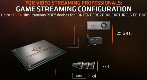 Az AMD a Ryzen Threadripper termékcsaláddal három tipikus munkafolyamatot céloz meg. Elsődlegesen a masszív I/O lehetőségek számítanak a platform előnyének, mivel mindegyik processzor hét darab PCI Express eszközt képes kezelni. A 64 darab PCI Express 3.0-s csatornából 4-et elvisz az X399-es vezérlőhíd, míg a maradék 60 tetszőlegesen elosztható, ugyanakkor az alaplapgyártók követik az AMD ajánlásait. Ezáltal három darab x4-es PCI Express 3.0-s csatornát használó NVMe SSD bekötésére van lehetőség, a maradék sávot pedig két x16-os, illetve két x8-os PCI Express 3.0-s portra érdemes fordítani.