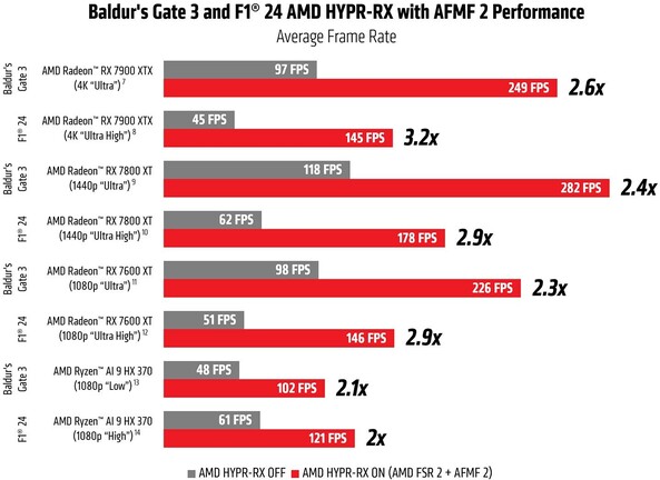 Mindkét mód alapértelmezetten Auto konfigurációval rendelkezik – ami egyénileg módosítható. Ez a keresőmód esetén a felbontáshoz állítja az optimális paramétert, míg a teljesítménymód során az IGP-k a gyorsabb beállítással futnak, a dedikált GPU-k pedig a lassabb, de jobb minőségűvel. A keresőmód egyébként már gépi tanulást is alkalmaz, tehát részben AI feladatról van szó. Az AMD mérései alapján az AFMF 2-nek rövidített újítás, aktív HYPR-RX-szel átlagosan 250%-os gyorsulást eredményez.