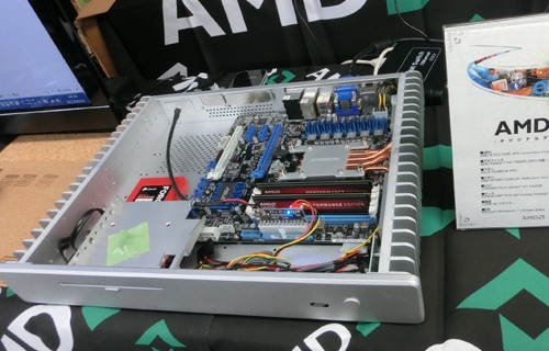 Mozgó alkatrészeket nélkülöző, azaz teljesen néma komplett PC-t mutatott be az AMD Tokióban. Az ASUS F2A85-M Pro alaplapba az adatlap tanúsága szerint egy eddig nem látott, 65 W-os TDP-vel rendelkező AMD A10-5700K Trinity APU került, mellé pedig 2x4 GB AMD 1866 MHz-es DDR3 modult pakoltak, az adatok tárolását pedig egy 240 GB tárkapacitású Corsair Force GT SSD-re bízták. Külön PCIe foglalatba illesztett grafikus kártyát természetesen nem alkalmaztak, a megjelenítéssel kapcsolatos számításokat az APU-ba integrált, 384 VLIW4 shader processzort tartalmazó HD 7660D intézte.