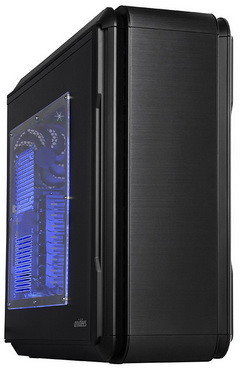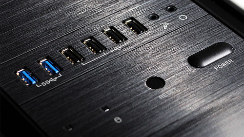 A méretes ajtó mögött az elülső ventilátorokat fedő hálót és három 5,25”-es meghajtó bővítőhelyet találunk. Ezek takaróeleme könnyen eltávolítható, több szegmenses kialakításuk révén 3,5 hüvelykes meghajtókkal is kompatibilisek. A nyomógombok és csatlakozók a ház tetején kaptak helyet, katonás rendben sorakozik 2 darab USB 3.0-s, 4 darab USB 2.0-s és a szokásos audio aljzatok, a sík alumínium felületből csupán a bekapcsoló gomb emelkedik ki.