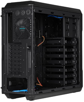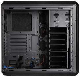 A beltér is hozza a külső alapján várt színvonalat, tágas, szellős és feketére fényezett. Adattárolóból összesen hetet (2,5”/3,5”) tornyozhatunk fel a 90 fokban elforgatott, több darabban eltávolítható keretekben. A merevlemezek fém fiókokban kerülnek rögzítésre, a keretek között (csakúgy, mint a tápegység körül) rezgéselnyelő gumi betétek izolálják a potenciális zajforrásokat. A kivehető HDD tartónak köszönhetően maximum 428 mm hosszú videokártyákat, processzor hűtőből pedig 175 mm magasságúakat fogad. Az alaplaptálcán gumírozott peremű kábelbujtató réseket a nagyobb CPU hűtők felszerelését segítő szerelőablakot is láthatunk.