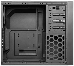 A könnyen eltávolítható oldallap mögött egy teljesen átlagos belső látványa fogadja a felhasználót. A meghajtók szerszámmentesen szerelhetők, a 90 fokban kiforgatott, méhsejt szerkezetű ráccsal fedett merevlemezkeretbe 2 db 2,5”-es és 5 db 3,5”-es adattároló (HDD/SSD) építhető. A keret fix, ezért a videokártyák vásárlása előtt érdemes figyelembe venni, hogy maximum 266 mm hosszú példányokkal bővíthető a konfiguráció.