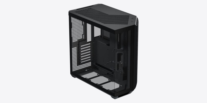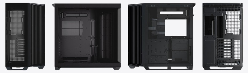 Az APNX legújabb, belülről vertikálisan kettéosztott V1 háza egy érdekes szerzet, mert bár a balján, illetve elején edzett üveglap figyel, a frontjának jobb széle 45 fokban meg van döntve, így a CPU és GPU közvetlenül kaphatja a frissítő légáramlatokat.