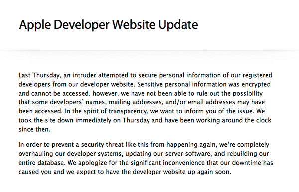 Az Apple tegnap levelet is küldött a mintegy 275 ezer regisztrált fejlesztőnek, amiben röviden tájékoztatta őket az esetről, valamint arról, hogy a kompromittált portált azonnal lekapcsolták, és a biztonsági rendszer komplett felújítása miatt bizonytalan ideig elérhetetlen lesz. A levélben nem kérték arra a fejlesztőket, hogy változtassanak jelszót, ami arra utalt, hogy a cég tényleg úgy gondolta, kritikus adatok nem kerültek rossz kezekbe. Ennek némileg ellent mond, hogy a Twitteren több tucat fejlesztő jelezte már, hogy automatikus rendszerüzenetet kapott jelszavának megváltoztatására, ami arra utal, hogy valaki mégis elkezdett próbálkozni a megszerzett adatok felhasználásával.