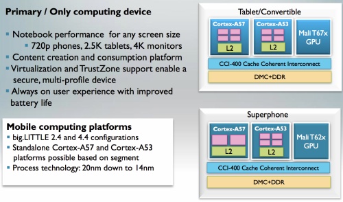 A vállalat ajánlásaiban a Big.Little koncepció aktívan meg is jelenik, így az ARM olyan szupertelefonokat (ez lesz az okostelefon új neve) vizionál, mely négy darab Cortex-A53 és két darab Cortex-A57 processzormagot használó modulokból áll, és ezt egészítené ki a Mali-T620 sorozatú IGP. A tabletekbe és a nagyobb mobil masinákba a négy darab Cortex-A53 mellé négy darab Cortex-A57 processzormag kerülne egy Mali-T670 sorozatú IGP társaságában. Ezek persze nem kőbe véset dizájnok, csupán az ARM felvázolta, hogy mit szeretne látni. Ettől nyilván a partnerek eltérhetnek, és el is fognak, hiszen az új generációs Mali IGP-k ugyan nagyon jók, de sokan saját megoldást fejlesztenek.