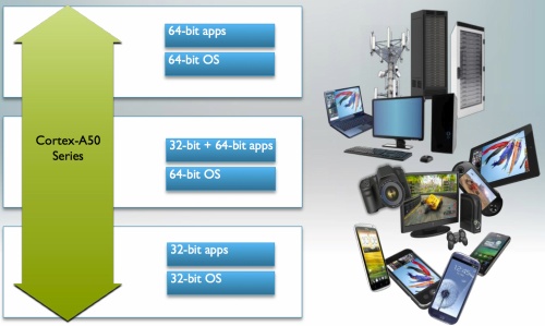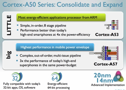 Az ARM egy évvel korábban jelentette be, hogy dolgoznak a 64 bites architektúrájukon, melyről pár hónapja kiderült, hogy két implementáció formájában lesz elérhető. A sok találgatás után a brit tervezőcég most végre bemutatta az újdonságok képességeit, melyek a Cortex-A50-es termékcsalád részei lesznek. Ahogy arra lehetett számítani az ARM a korábban már részletezett Big.Little koncepcióval dolgozik. Ennek megfelelően a Cortex-A57 a nagy teljesítményre, míg a Cortex-A53 inkább az alacsony fogyasztásra van kihegyezve. Ez persze nem azt jelenti, hogy előbbi ne fogyasztana keveset, vagy utóbbi nem elég gyors, csupán viszonylagos kategorizálásról van szó.