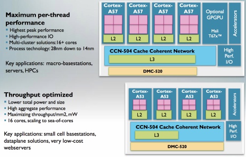A Cortex-A53 és Cortex-A57 esetében fontos tulajdonság, hogy a négy magot alkalmazó modulok komoly mértékben skálázhatók, így a nemrég részletezett CoreLink CCN-504 bevetésével 16 magból álló processzorok is építhetők, melyeket az ARM a szerverekbe ajánl.