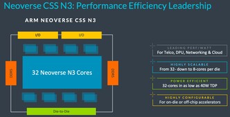 A Neoverse V3 az első teljesítményorientált dizájn, ami kap Neoverse CSS kialakítást is, ami lényegében nagyobb IP blokk formájában történő licencelést jelent, vagyis a megrendelő egy már validált, több magból álló klasztert kérhet, amit beépíthet a saját dizájnjába. Ez a rendszer maximum 64 darab V3 processzormagból állhat, a memóriavezérlő DDR5, LPDDR5 vagy HBM3 szabványú memóriákat kezelhet, miközben elérhető a CXL 3.0 is a PCI Express 5.0-hoz. Az említett kialakítással két darab 64-magos chiplet köthető össze egy tokozáson belül.