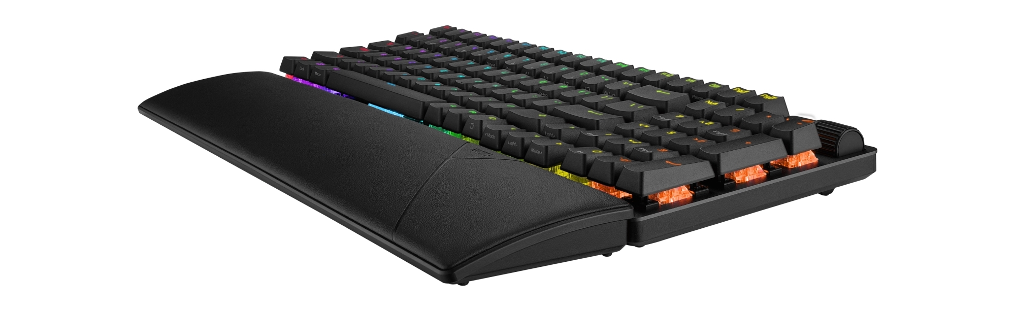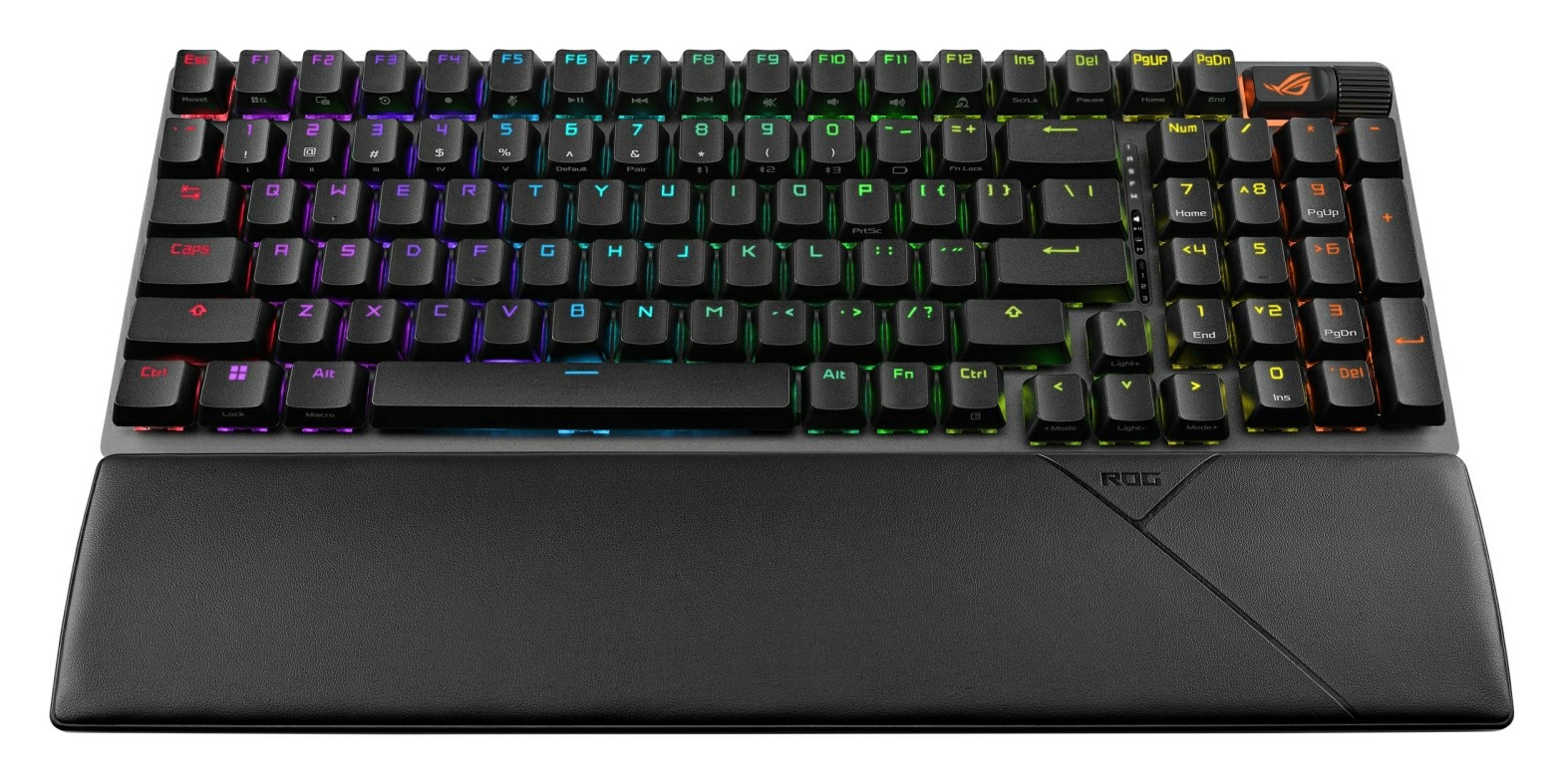 A fekete színű, lebegőgombos klaviatúra gyorscserés foglalataiba alapból a gyártó kenésben részesített, lineáris karakterisztikájú ROG NX Snow (40/53 gf, 3,6/1,8 mm) kapcsolói kerültek, amelyeken fényesedést gátló UV-bevonattal ellátott, a gombonként címezhető Aura Sync világítást átengedő ABS kupakok ülnek. A lubrikált stabilizátorokkal szállított billentyűzet belsejében két réteg csillapítás – egy szilikongumi betét és switch padek – igyekszik a mélyebb tónusok felé terelni a gépelési akusztikát, mialatt elnyeli az általában nemkívánatos zajokat (esetleges pengés, üregesség). A jobb felső sarokban egy multifunkciós görgőt helyeztek el a színesen világító ROG logó szomszédságában.