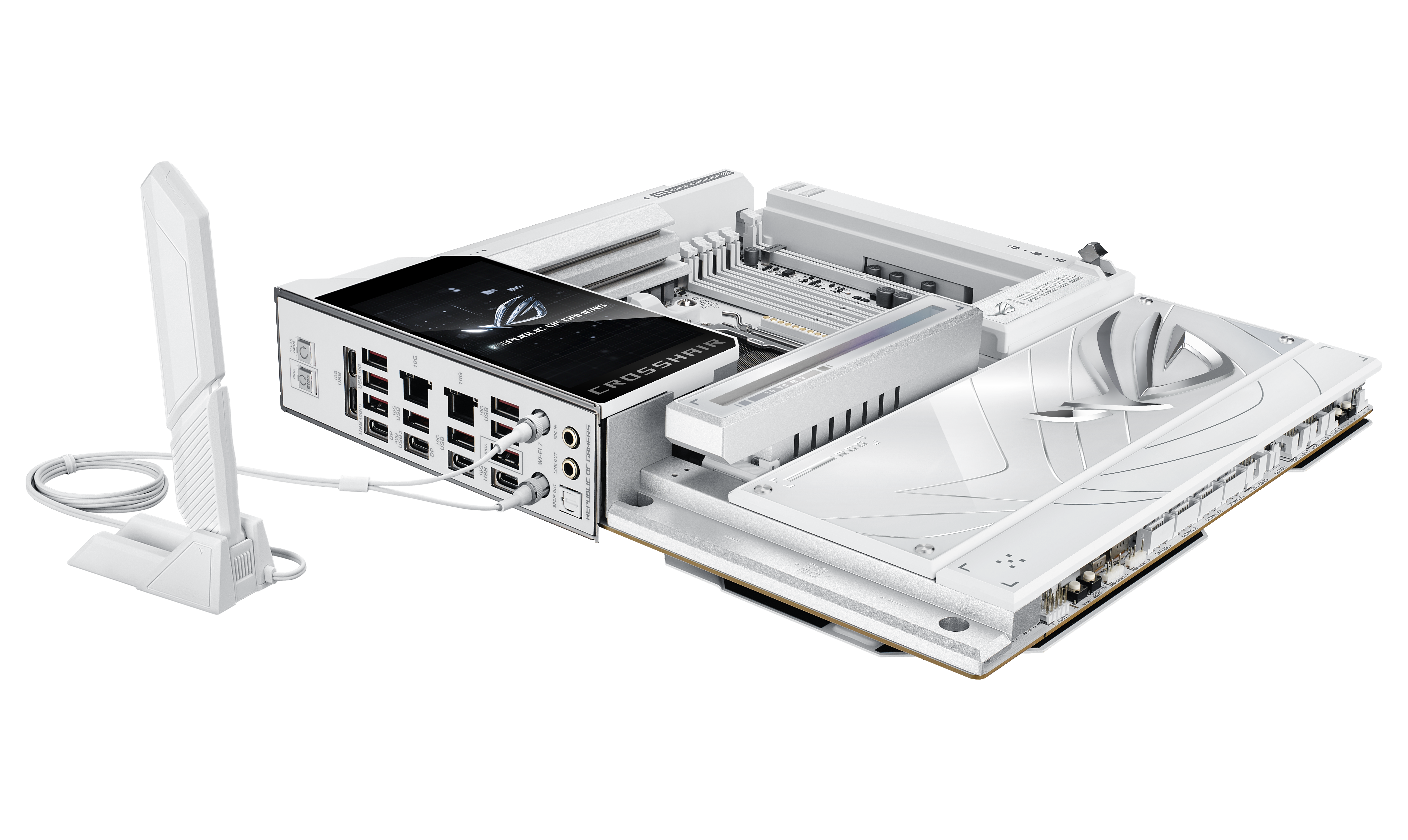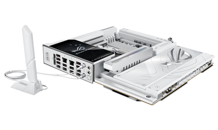A Crosshair széria csúcsmodellje más szempontból is a maximumot hozza, hiszen van két darab 10 Gbps-os Ethernet is rajta a Wi-Fi 7 támogatása mellett, az egyszerű, eszközmentes szerelhetőséget az EZ PC DIY elemek biztosítják, továbbá egy beépített 5 hüvelykes LCD kijelző is került az alaplapra, ami nem csupán esztétikai elem, hanem rendszerinformációkat és egyedi grafikát is meg tud jeleníteni.