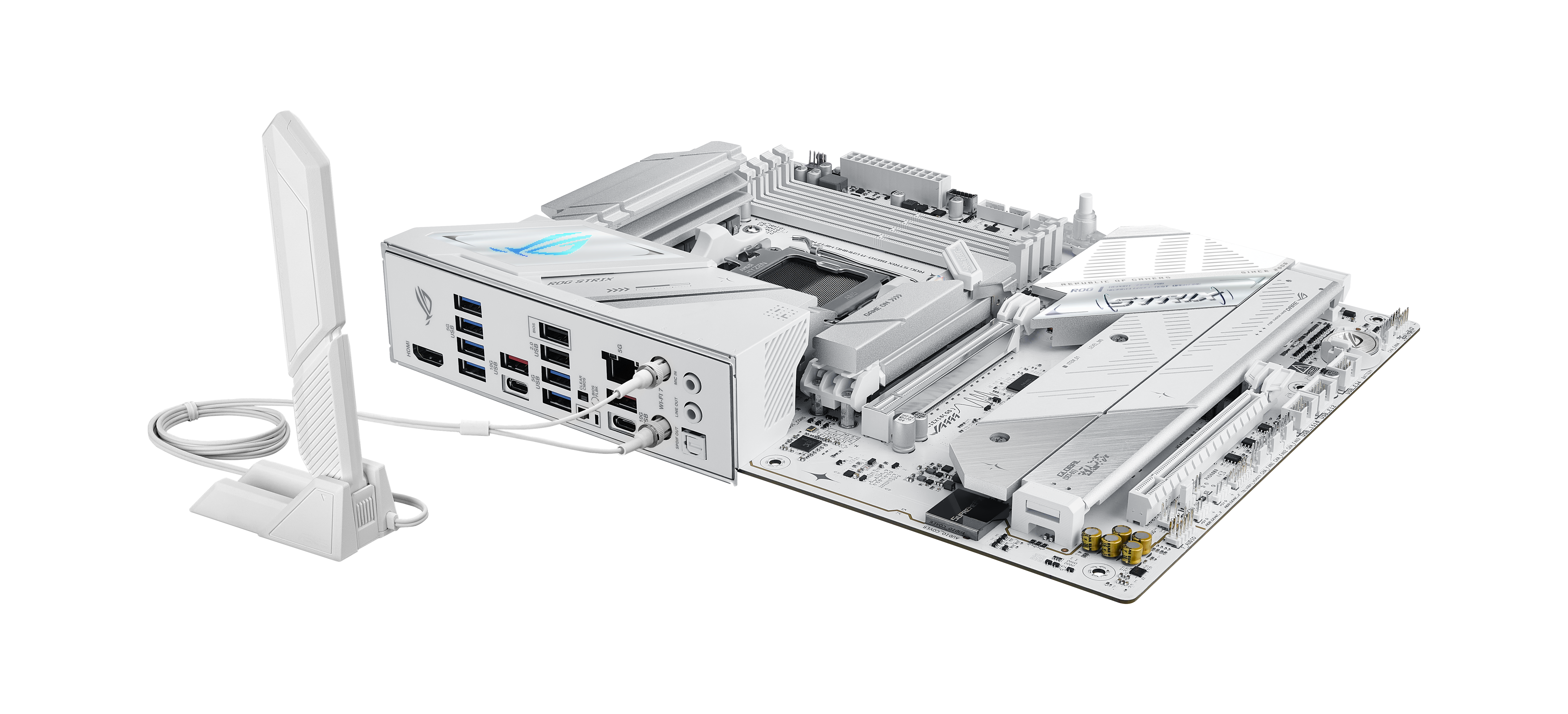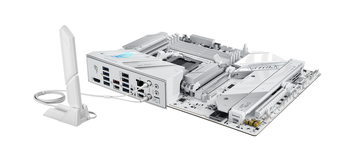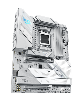 A fehér megoldás rengeteg extrával van felszerelve, többek között a PCI Express 5.0-s SSD-k hűtésére a 3D Vapor Chamber M.2 megoldás szolgál, amely nagyobb hőleadó felületet és hatékonyabb hőelvezetést biztosít. A tárhelybővítés szintén kiemelkedő, elvégre akár hét darab M.2-es adattároló is beépíthető (Hyper M.2 és Q-DIMM.2 kártyával), bár ha ezt teljes egészében kihasználjuk, akkor némelyik SSD PCI Express 4.0-s sávokat fog használni. A VGA-kat két darab x16-os PCI Express 5.0-s csatoló várja, de az összesen rendelkezésre álló sávok mennyisége 16-ra van korlátozva, tehát két VGA használata mellett nyolc-nyolc sávval kell kalkulálni. A megadott paraméterek a Ryzen 7000 és 9000 sorozatú asztali CPU-kra vonatkoznak, az APU-k esetében kevesebb PCI Express sáv vethető be.