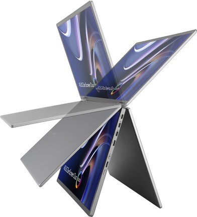 Amit kapunk, az tulajdonképpen két darab 14”-es OLED képernyő, munkabarát, 16:10 képaránnyal, 1920x1200 pixeles felbontással, teljes DCI-P3 színtérrel, DisplayHDR 400 True Black tanúsítvánnyal és a gyári kalibrációnak köszönhetően 2 alatti delta E értékkel. A két kijelző a 360 fokos kinyitást lehetővé tévő zsanéroknak köszönhetően az átalakítható notebookokhoz hasonlóan különböző állásokban is használható, „sátorként” nézhetjük két oldalról, vagy éppen a hátoldalról kihajtható támasz segítségével mint egy 20”-es monitort, fel is állíthatjuk noteszgépünk mellé.