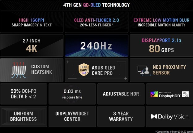 A kijelző kívülről a klasszikus ROG-dizájnt viszi tovább széles, háromágú talpával, és magasságállítást, valamint pivotot is kínáló állványával, ami képes az asztalra is levetítetni a ROG logót, felül pedig egy állványmenetet találunk rajta például webkamera rögzítéséhez. A panel 1000 nit csúcsfényt képes biztosítani HDR üzemmódban, és 0,03 ezredmásodperces válaszidővel dolgozik. A DCI-P3 színtér lefedettsége teljes, a HDR szabványokból pedig mind a Dolby Visiont, mind a HDR10-et támogatja.
