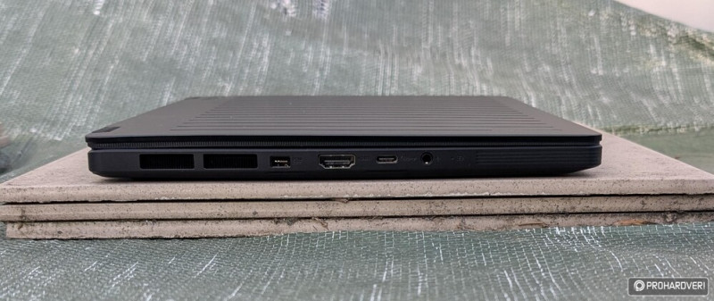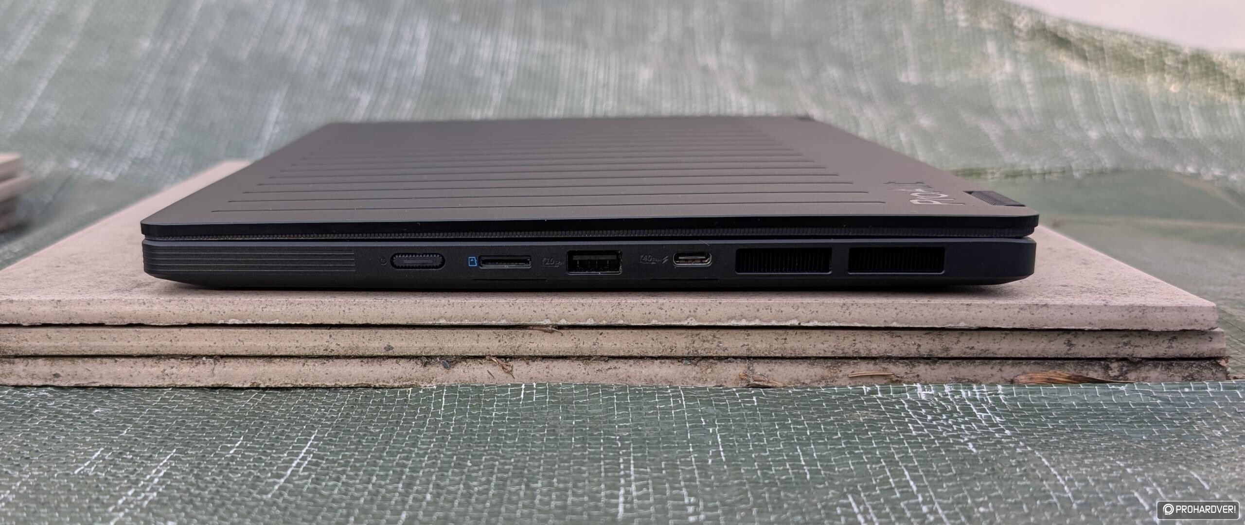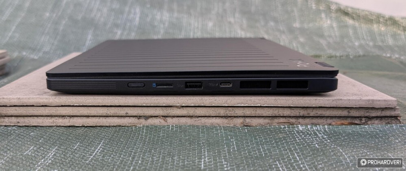 Gépünk oldalain az erős hardverre utaló szellőzőnyílások mellett két USB4, egy USB 3.2 Gen 2 Type-A, egy HDMI 2.1 FRL és egy kombojack található, és ezeken felül egy microSD 4.0 kártyaolvasó is rendelkezésre áll a kamerás felvételek minél gyorsabb átviteléhez.