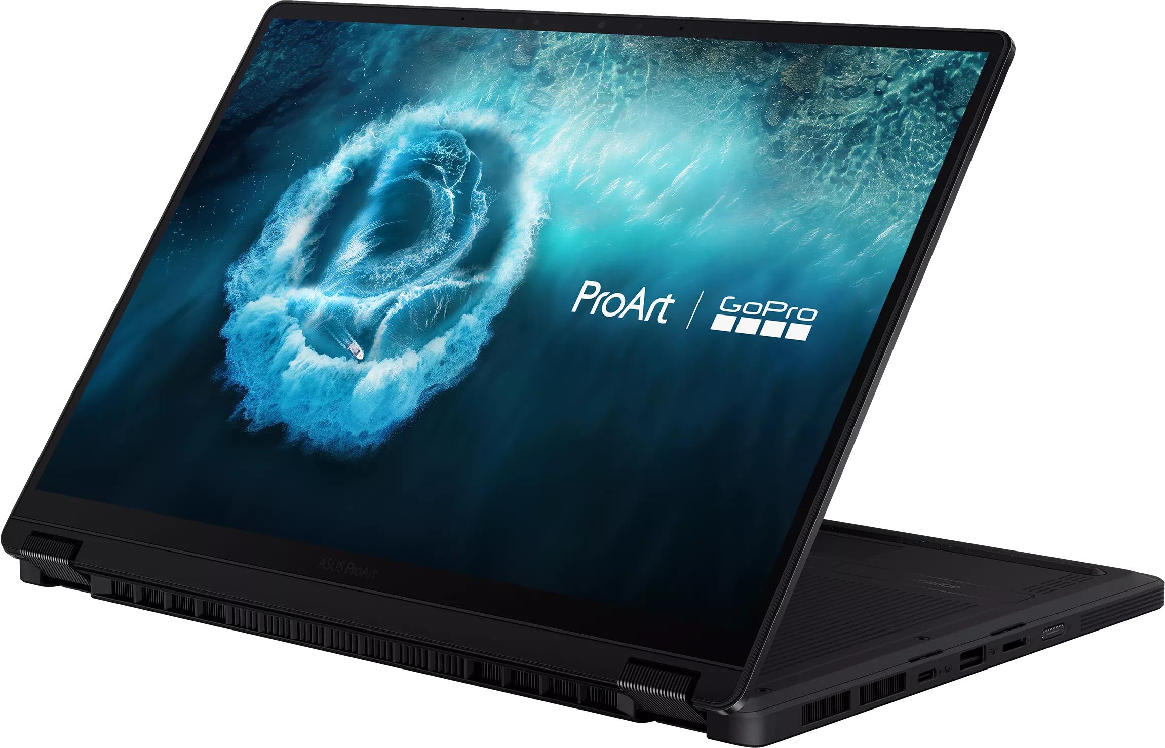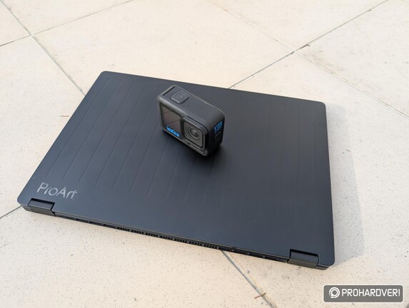 A ProArt PX13 szériát a tajvani cég a 2024-es CES-en mutatta be, és az első generáció még a Strix Point platformot kombinálta 4000-es szériába tartozó GeForce GPU-val a megfelelő számítási teljesítmény biztosítására. A kijelző szerepét egy 13 hüvelykes érintésérzékeny OLED panel vállalta magára, mindez pedig egy viszonylag kompakt, 1,4 kg-os, 16 mm vastag gépházban kapott helyett. Ez az összeállítás elsősorban azoknak szólt, akik nem csak az irodában vagy otthon, az asztalon dolgoznak majd kreatív projekteken, hanem külső helyszíneken, netán mozgás közben is. Ezt gondolja még egy lépcsőfokkal tovább cikkünk alanya, a PX13 GoPro Edition, mely kifejezetten az akciókamerás felvételekkel dolgozó operatőrök, YouTuberek, influenszerek munkaeszköze lehet, még erősebb hardverrel és különleges kiegészítőkkel.A notebook persze alapból továbbra is egy 13 hüvelykes, 2 az 1-ben eszköz, mely strapabíró és elegáns fém burkolatot kapott, két darab kéttengelyes zsanérral. A kijelző kerete a trendeknek megfelelően igen vékony, így az előlap 85%-át fedi le.