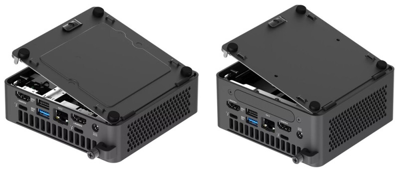 A 117 x 112 x 37 mm-es vékony, illetve 117 x 112 x 54 mm-es magas változatokban készülő megoldás alaplapján egy M.2280, plusz egy M.2 2242 slot található, és mindkettőbe PCI Express 4.0-s SSD-t kérhetünk, a 128 GB-tól kezdve 2 TB-os kapacitásig bezárólag. Míg a sima Core CPU-val szállított modellekben Intel BE202-es Wi-Fi 7/Bluetooth 5.4 modul dolgozik, addig Core Ultrás testvéreikben BE201-s hálózati egység figyel, de a 2,5 gigabites Ethernetet egyöntetűen Intel i226-V/LM kontroller hajtja.