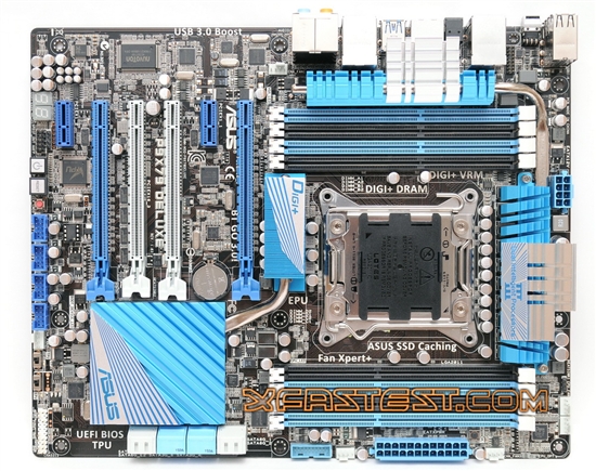 Ennek köszönhetően már most tüzesen megvizsgálhatjuk az alaplap felépítését és felszereltségét, már amennyire a képek felbontása megengedi. A processzort fogadó 2011 tűs foglalat két oldalán négy-négy darab DDR3 foglalat található, azaz a négycsatornás vezérlő minden egyes csatornája két darab DDR3 DIMM modult fogad, összesen 64 GB memória pakolható az alaplapba. A DIGI+ tápellátó áramkörökre hőcsöves hűtés került, és ami még jobb hír, hogy az X79 PCH is hasonló hűtést kapott, tehát, ha a kép valódi, akkor a zsúfolt elrendezés ellenére sem lesz a chipseten ventilátor.