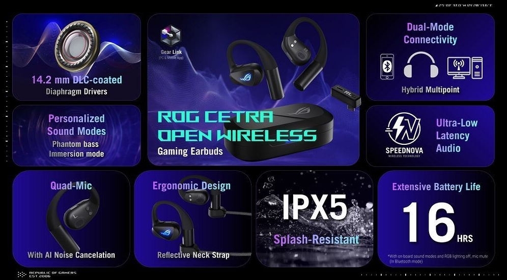 A közelmúltban az ASUS egy új vezetékmentes gaming headsettel, a ROG Cetra Open Wireless Gaming Earbuds nevezetű megoldással gyarapította kínálatát, amelynek 14,2 mm-es, szénszálas bevonatú diafragmás driverei a 20-tól 20 000 Hz-ig terjedő frekvenciaválasz-tartományt képesek visszaadni, és 2,4 GHz-es ROG SpeedNova rádióval vagy 6.0-s Bluetooth-szal tud csatlakozni a hangforráshoz.