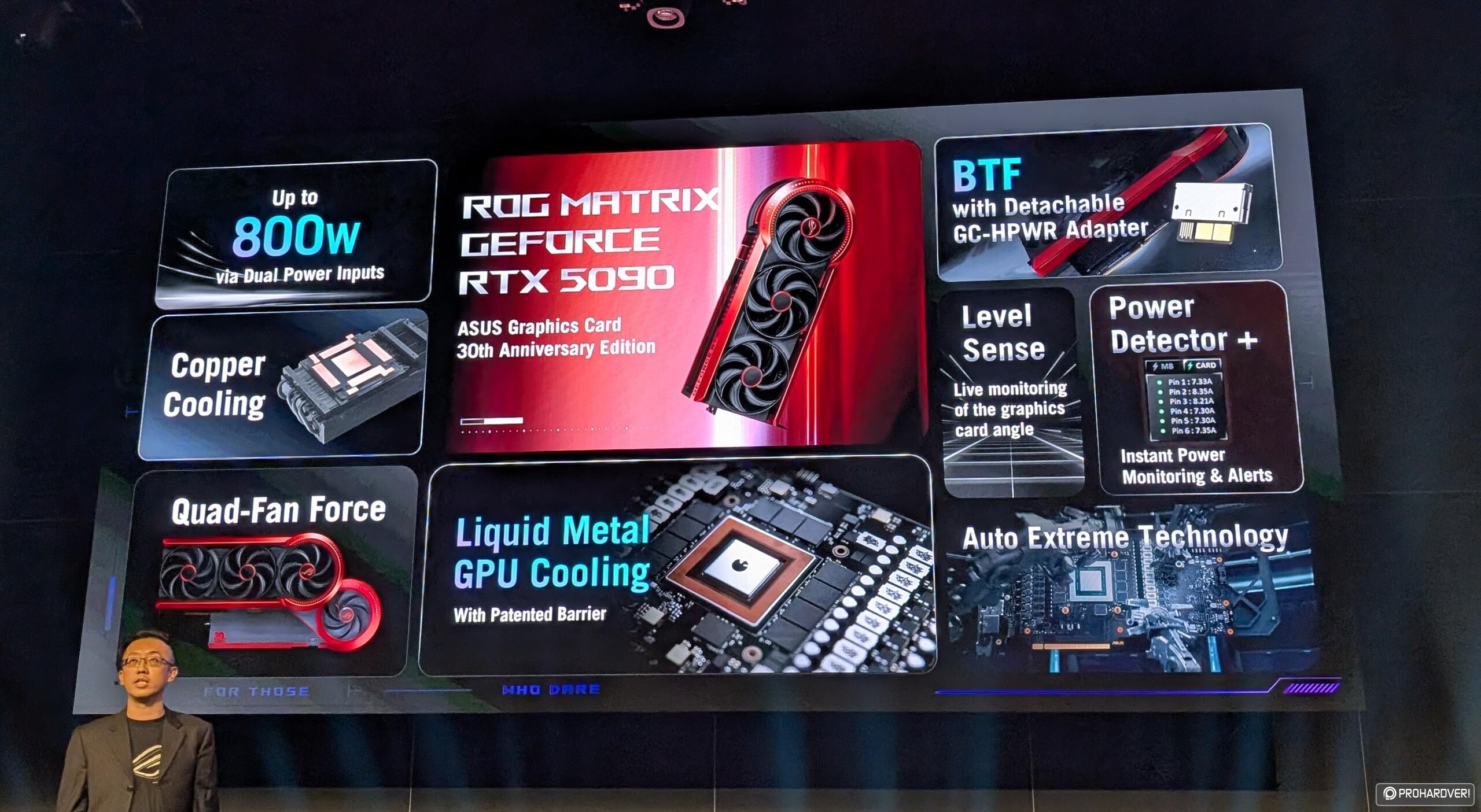 A ROG Matrix Platinum GeForce RTX 5090 30th Anniversary Limited Edition névre keresztelt vezérlő 357,6 mm-es hosszához 149,3 mm-es magasság, illetve 76 mm-es vastagság társul, és 3,8 PCI bővítőhelyet foglal el gépházunk hátuljában. Az 512 bites memóriabusszal dolgozó, 21 760 CUDA maggal szerelt óriás három főventilátorának középső darabja a turbulencia csökkentése végett ellentétes irányban forog szomszédaihoz képest, azonban a túloldalon egy negyedik légkavaró gyorsítja fel a réz hőkamrával operáló blokk átszellőzését.