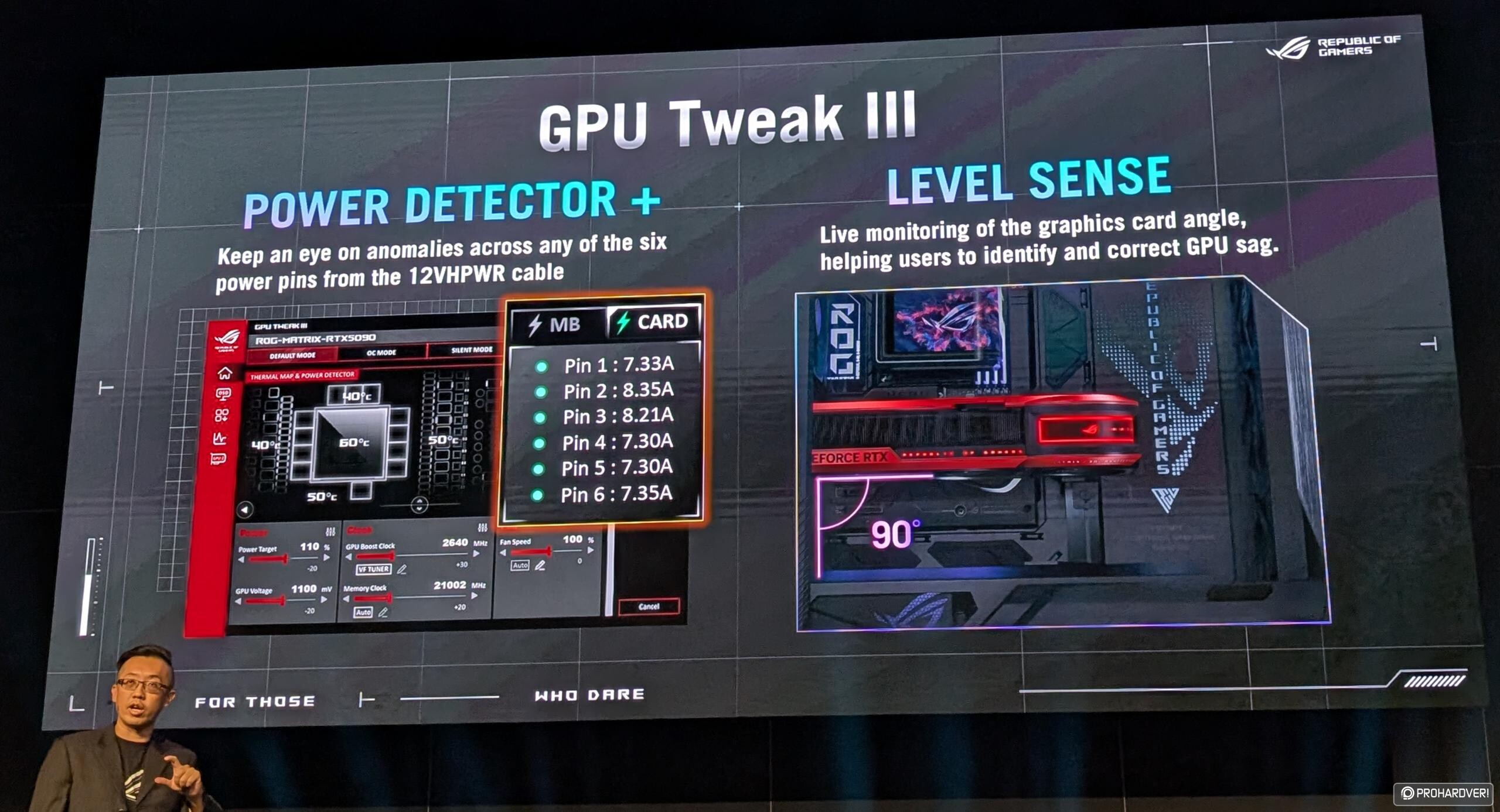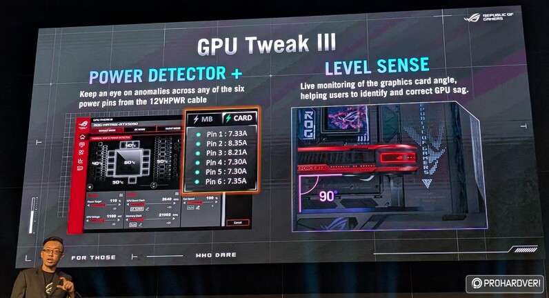 Érdekes extra, hogy a kártyára több, annak fizikai állapotát is monitorozó érzékelő került. Ezek egyike a Power Detector+, mely a 12V-2x6 kábel állapotát figyeli, és riaszt, ha annak bármelyik érintkezőjén (vagyis a hozzá tartozó vezetéken) rendellenességet tapasztal. A másik szenzor a Level Sense névre hallgat, és egyszerűen a grafikus kártya vízszintes helyzetét felügyeli. Ha úgy tapasztalja, hogy ez változik, például azért, mert az alaplapi csatlakozó kezd meghajolni a tetemes súly alatt, értesít bennünket, így még időben közbeavatkozhatunk, például a VGA-támaszték beállításával.