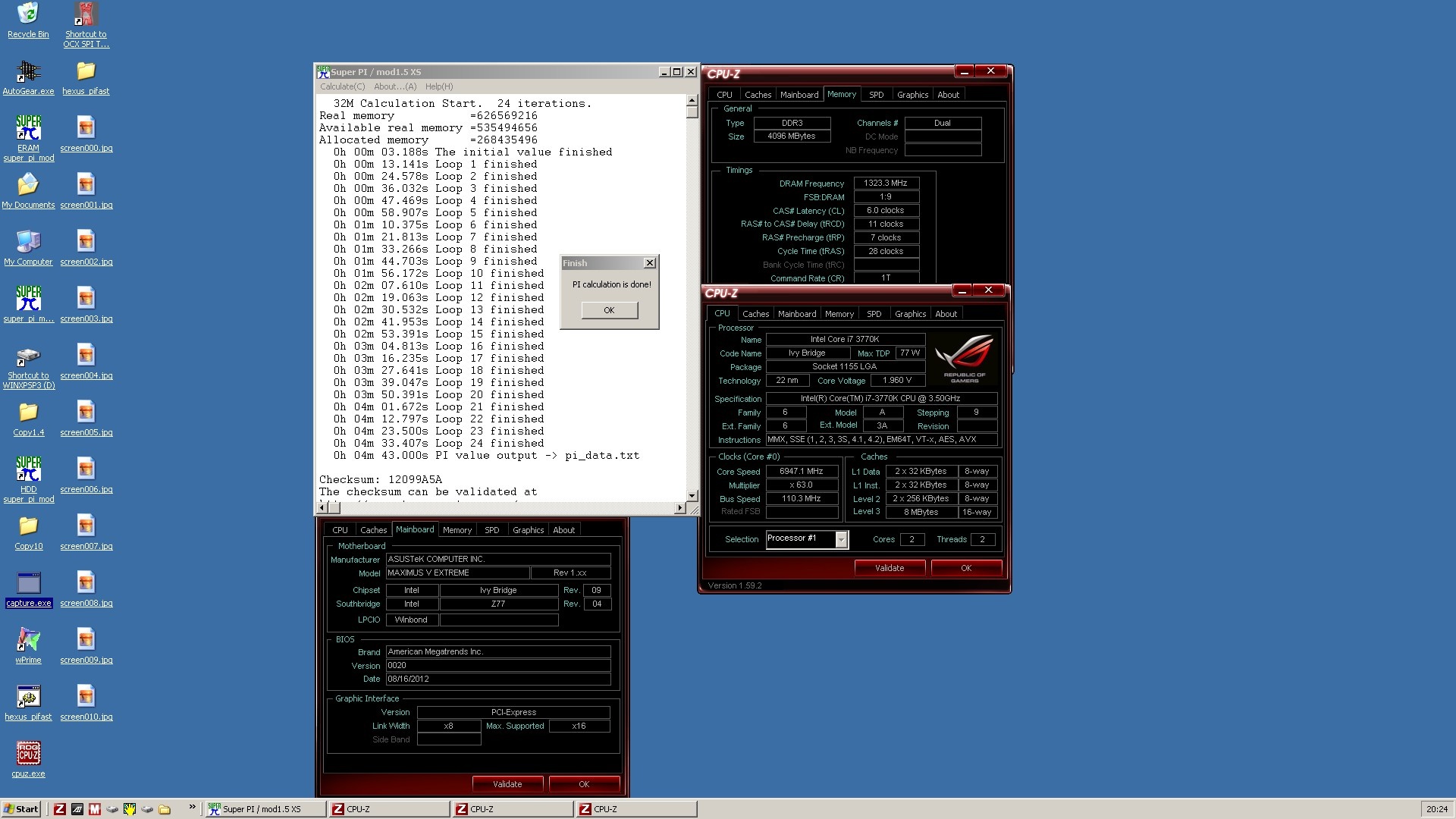 Az Ivy Bridge-re épülő termékek versenyében a fentebb említett órajel a valaha elért legnagyobb érték, és ehhez folyékony héliumot kellett bevetni. Ha már tuning, akkor a programok is előkerültek, így sikerült megdönteni a SuperPi 1M, a 32M és a PiFast világrekordokat. Az eredményeket rendre 7043, 6947 és 7017 MHz-es órajelen sikerült beállítani, a hűtésről pedig ezúttal folyékony nitrogén gondoskodott.